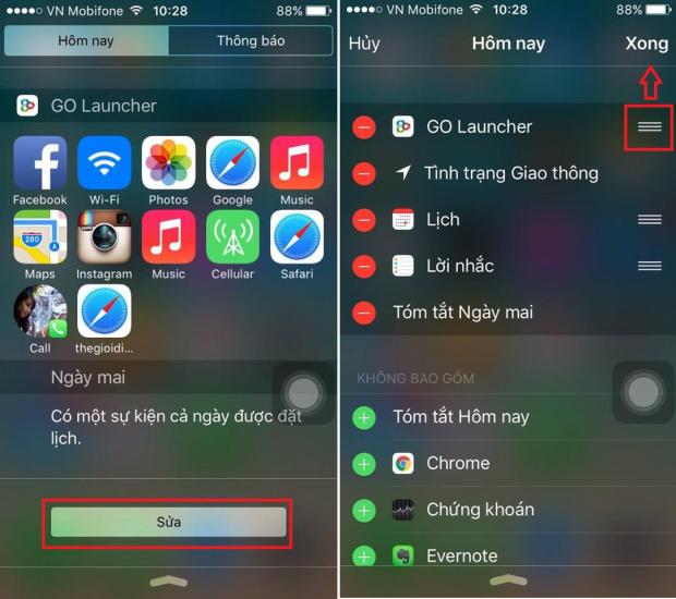 Vậy là xong, bây giờ các bạn bấm Home để quay về màn hình chính. Tiến hành kéo thanh Notification xuống chọn vào chỉnh sửa và kéo GO Launcher lên đầu tiên.