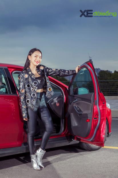 Trong bộ hình mới thực hiện với Xe Đời Sống, Châu Bùi thể hiện phong cách thời trang cá tính, sang trọng với chiếc Ford Focus màu đỏ - một màu sắc mà cô nàng khá yêu thích. Chọn mix giữa quần da bó thon gọn cùng với áo khoác da độc đáo, hot girl khéo léo làm nổi bật được phong cách thời thượng hợp với chất thể thao năng động của Focus. Nếu Chou Chou có một gương mặt sắc sảo hút hồn thì “gương mặt” của Focus cũng sắc sảo không kém cạnh, với tạo hình của đèn pha, lưới tản nhiệt và cản trước.