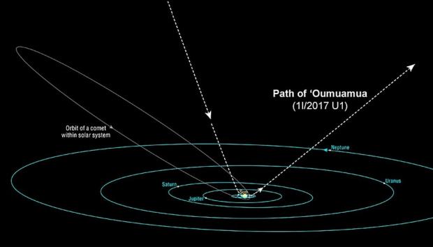 Câu hỏi đang bị bỏ ngỏ đối với các nhà thiên văn là Oumuamua đến từ đâu. Hiện tại Oumuamua đang bay theo một quỹ đạo hình chảo. Giống như khi bạn ném một quả banh tennis xuống đất, sau khi rơi xuống dưới mặt phẳng vật chất của hệ Mặt Trời thì Oumuamua đang nẩy lên trở lại tại vùng không gian nằm giữa quỹ đạo của Trái Đất và sao Hỏa. 'Điếu xì gà bay' này hiện đang bay rất nhanh ra khỏi tầm quan sát của các kính thiên văn của chúng ta.