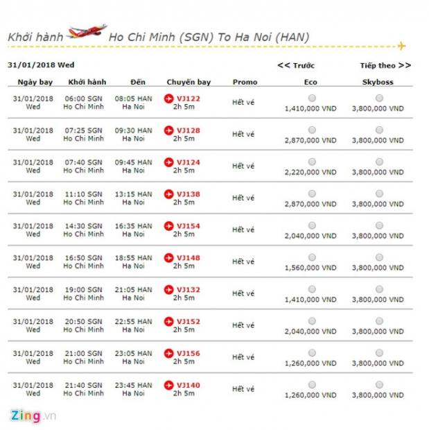 Trên website bán vé của Vietjet Air, vé hạng Promo (rẻ nhất) chiều TP.Hồ Chí Minh - Hà Nội và Hà Nội - TP.Hồ Chí Minh giai đoạn 31/1/2018 hầu như hết sạch, chỉ còn hạng Eco, Skyboss. Trong khi đó, tại Vietnam Airlines, nhiều chuyến bay trong giai đoạn này chỉ còn lại một vài ghế ở hạng phổ thông còn lại là ghế của hạng thương gia.