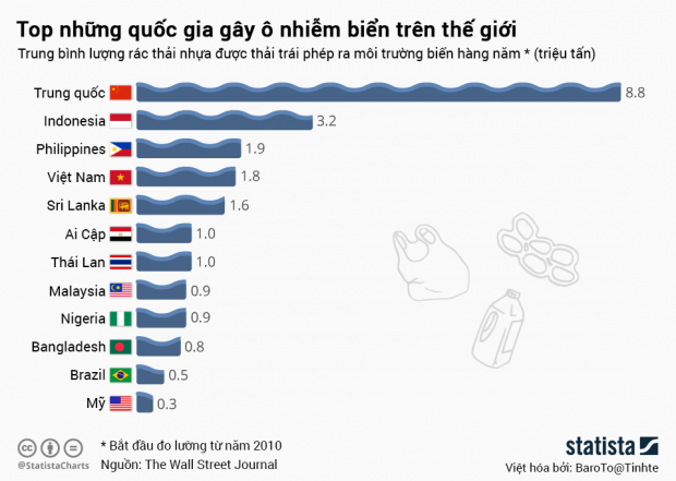 Trung Quốc là nước đứng đầu với 8.8 triệu tấn rác thải nhựa được thải trái phép ra môi trường biển mỗi năm, Mỹ cũng nằm trong top các quốc gia gây ô nhiễm biển tuy lượng rác thải ít hơn Trung Quốc rất nhiều. Việt Nam cũng có tên trong danh sách này.
