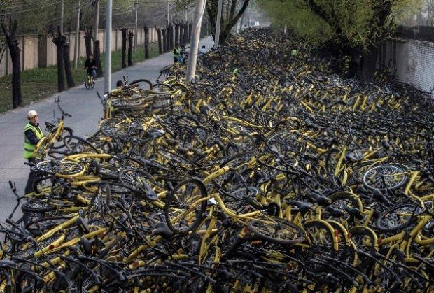 Xe đạp phế thải chất cao như núi ở Hạ Môn, Trung Quốc. Ảnh: TheGuardian.