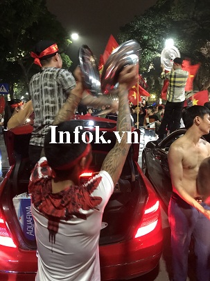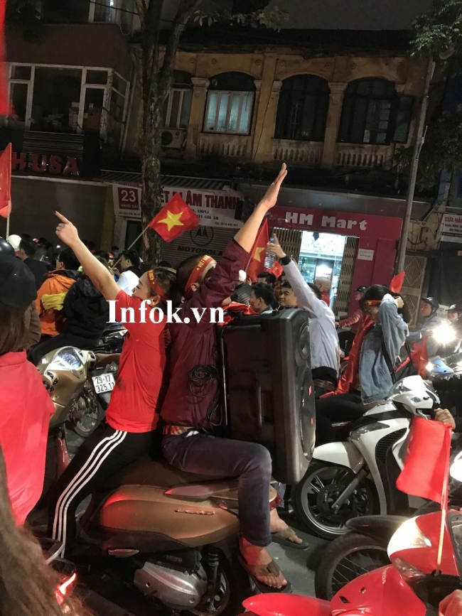 Ngay sau khi đội tuyển U23 Việt Nam đánh bại U23 Qatar bằng loạt sút luân lưu, hàng vạn người dân Hà Nội mang cờ Tổ Quốc, kèn, trống, loa... đổ ra đường ăn mừng chiến tích lịch sử.