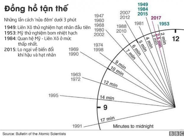 Để dễ hình dung về mức độ nghiêm trọng của tình trạng lần này, lần cuối cùng chiếc đồng hồ ở vị trí cách nửa đêm là hồi năm 1953, sau khi Mỹ và Liên Xô liên tục các bài thử nghiệm bom hydro. Và nhiều ý kiến đã chỉ ra rằng hình tượng chiếc đồng hồ tận thế vẫn còn quá đơn giản so với sự phức tạp của nguy cơ hạt nhân hủy diệt nhân loại ngoài thực tế. Và kỳ thực, mối đe dọa từ vũ khí hạt nhân vẫn còn đó và “không bao giờ biến mất” do những lời nói, hành động của lãnh đạo quốc gia nhiều nước.”