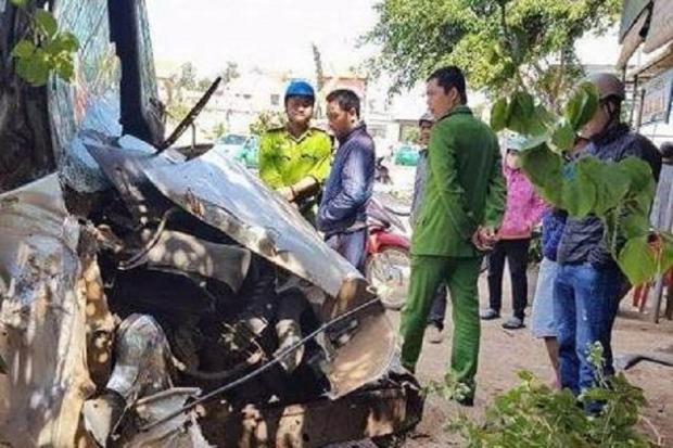Chưa dừng lại, xe ô tô khách tiếp tục đâm vào trụ cây trước một tiệm vàng rồi mới dừng lại.