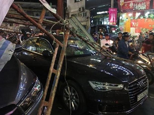 Mưa, gió trái mùa làm đổ giàn giáo đè trúng ô tô sang
