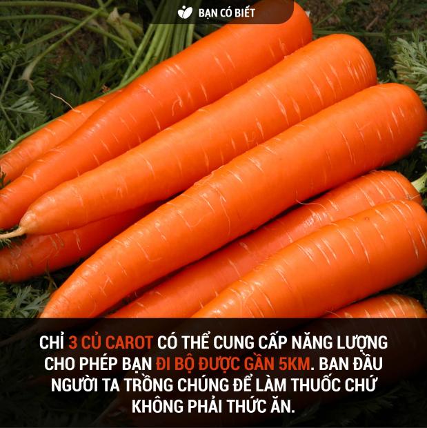 Lại thêm một sự thật thú vị khác và chủ đề của nó là về cà rốt. Bạn có biết rằng chỉ cần ăn đủ 3 củ cà rốt đã có thể cung cấp năng lượng để bạn đi bộ được gần 5km. Tuy nhiên, ban đầu khi người ta trồng cà rốt thì mục đích không phải là để xào, trộn gỏi hay nấu canh xương mà thực ra là để làm thuốc chữa bệnh.