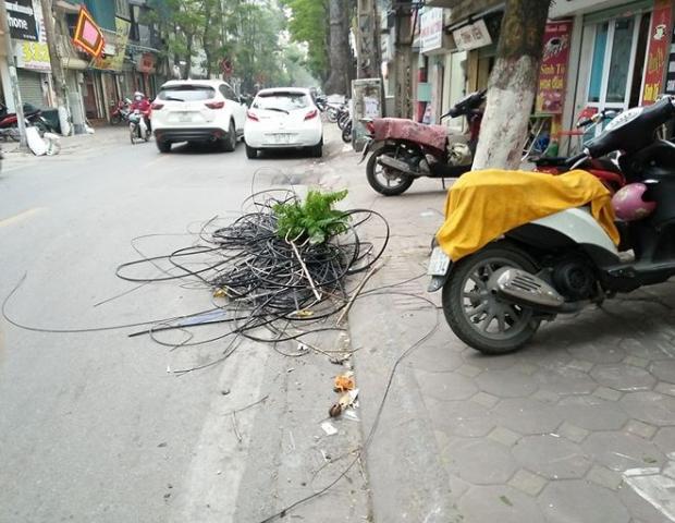Cũng trên tuyến đường Đội Cấn, còn một số điểm dây cáp cũ tháo dỡ vứt thành bó chiếm lòng vỉa hè: