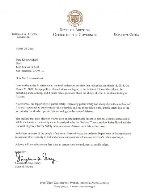 Bức thư ông Doug Ducey – thống đốc bang Arizona gửi Tổng Giám đốc Uber Dara Khosrowshahi