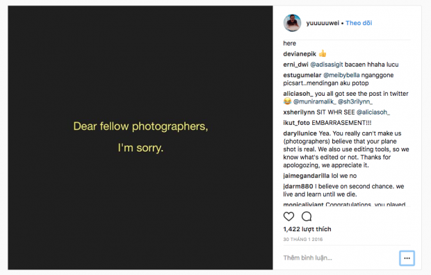 Còn nhớ, vào khoảng tháng 1 năm 2016, hãng máy ảnh Nikon đã phải đau đầu khi trao giải cho Chay Yu Wei trong cuộc thi Nikon Award với hình ảnh chiếc máy bay được cắt ghép vào trong khung ảnh. Nhanh chóng thôi, vụ việc được phanh phui và trở thành đề tài đàm tiếu rất nóng trên mạng với rất nhiều ảnh chế vui nhộn. Sau đó, Yu Wei cũng đã đăng đàn với lời xin lỗi trên instagram của mình. May mắn thay, anh lời xin lỗi của anh nhận được tha thứ khá nhiều, và anh vẫn còn đam mê nhiếp ảnh, vẫn chụp ảnh. Nhưng sự nhiệp thì...hạ hồi sẽ biết.