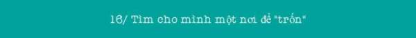 Hãy tìm cho mình một nơi xa lạ, nhưng không phải thực sự xa lạ để làm chỗ 'trốn'. Trốn ở đây không phải là trốn tránh mà chỉ để bạn có một nơi bình tâm lại, một nơi cách xa những rối rắm ngoài kia.