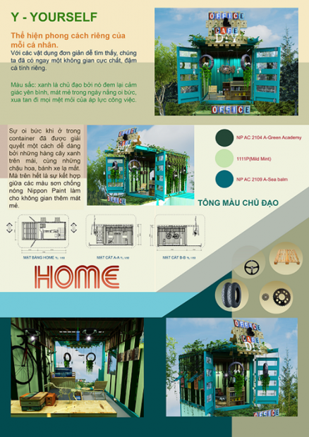 Tại NPYDA 2015, tác phẩm “Colour do it yourself” của nhóm DIY đã xứng đáng giành giải Tài năng Ý tưởng màu sắc ở mảng Thiết kế Nội thất. DIY chia sẻ: “Đối tượng chúng tôi đang hướng đến là những bạn trẻ, sinh viên mới ra trường không đủ điều kiện về mặt tài chính để mua đất xây nhà và kinh doanh. Từ đó đã thúc đẩy chúng tôi hình thành nên ý tưởng xây dựng một không gian có sự kết hợp như nhà ở, văn phòng, coffee trên những khu vực đang qui hoạch bằng chất liệu là những container cũ… Thiết kế ấy giúp các bạn trẻ tiết kiệm tài chính cũng như cải tạo lại không gian phù hợp với nhu cầu sử dụng”. Điểm nổi bật ở công trình này là sự phối hợp màu sắc của Nippon Paint thông minh và khoa học.