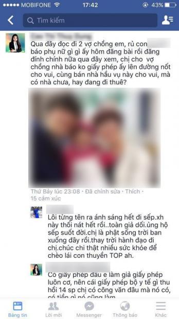 Ảnh chụp màn hình sự việc gia đình chị H bị nói xấu. bài viết này đã nhận được nhiều lượt comment và chia sẻ từ cộng đồng mạng