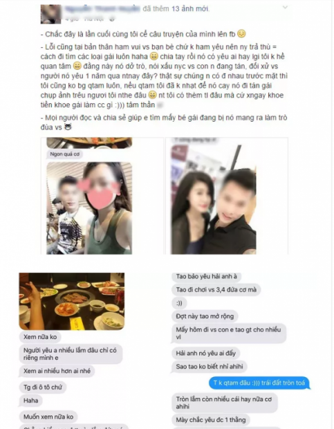 Mới đây nhất, một bài viết khá bức xúc của cô gái trẻ T.H đã khiến nhiều người không khỏi bất ngờ về một anh chàng có nickname là B dù vẻ ngoài khá đẹp trai nhưng lại có cách hành xử không mấy văn minh sau khi chia tay người cũ. Theo chia sẻ của H thì trước đây hai người đã từng yêu nhau nhưng kể từ sau khi đường ai nấy đi, anh chàng này thường xuyên “tra tấn” cô bởi những tin nhắn khoe khoang rằng mình đang cặp kè với nhiều cô gái xinh như hotgirl lại vô cùng chiều chuộng người yêu. Điển