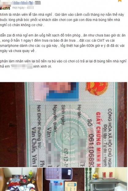 Dẫn trai đi nhà nghỉ em ăn uống hết sạch đồ trên phòng, ăn như chưa bao giờ được ăn, xong ở hẳn một ngày một đêm, buổi trưa ra báo đi ăn trưa. Đặt cọc chứng minh thư và martphone dành cho các cụ già. Tổng thiệt hại gần 600 nghìn giờ em ấy đi đã được vài ngày và chưa quay về . Phận làm nhân viên lại bỏ tiền ra bù vào có chơi có trả ai lại đi bùng tiền nhà nghỉ'.