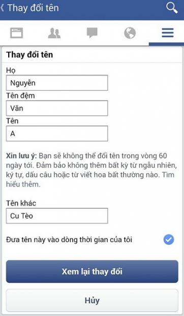 Bạn có thể đọc một số lưu ý của facebook là không được đổi tên facebook trong vòng 60 ngày, bước tiếp theo. Nếu bạn muốn thay tên facebook trên điện thoại mà bạn chưa đủ 60 ngày. Bạn có thể chọn một trong các tên facebook cũ đã dùng nếu muốn thay đổi. Như vậy tên facebook của bạn sẽ luôn được hoán đổi mà không phạm luật của facebook.Các bạn có thấy thay tên facebook trên điện thoại dễ không nào? Bài viết tiếp theo mình sẽ hướng dẫn các bạn thay tên facebook bằng những ký tự đặc biệt. Các bạn có muốn thử không nào. hẹn gặp lại các bạn.