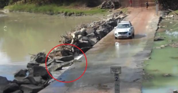 Gần đây, một người dân ở Úc lái xe chở 3 bạn bè ra ngoài, nhưng khi đi đến một con sông thì xuất hiện một con cá sấu ở phía trước, làm cho người trên xe lạnh người toát mồ hôi. Trong khi mọi người không biết phải làm sao thì cá sấu chậm rãi bò sang bên kia sông, lại để cho mọi người một phen ăn mừng vì được bình an vô sự.