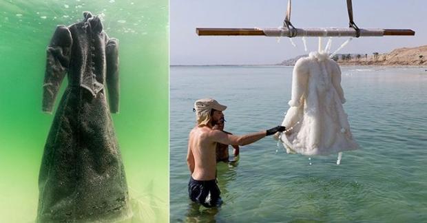 Khi thực hiện nghiên cứu trong một dự án mới của mình, nghệ sĩ người Israel là Sigalit Landau đã quyết định ngâm chiếc áo choàng trong biển đen. Chiếc áo được ngâm trong vùng viển có độ mặn cao vào năm 2014. Tuy nhiên, mới đây nhóm nghiên cứu đã vớt chiếc áo lên và thấy chiếc áo choàng họ ngâm đã biến mất, giờ chỉ còn chiếc áo tinh thể muối phát sáng lấp lánh. Chúng ta có thể nhìn thấy chiếc áo tuyệt đẹp này qua hình ảnh. Kết quả thật đáng kinh ngạc!