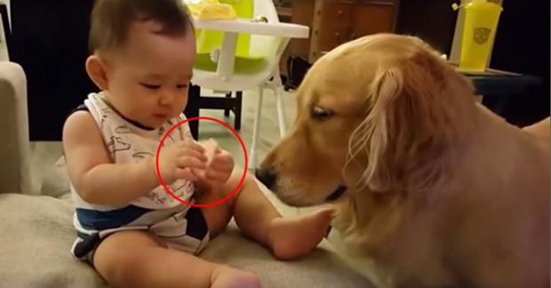 Chú chó Golden này đang nhìn chằm chằm đồ ăn của em bé nhưng em bé không hiểu chỉ lo ăn một mình khiến chú chó chảy nước miếng.