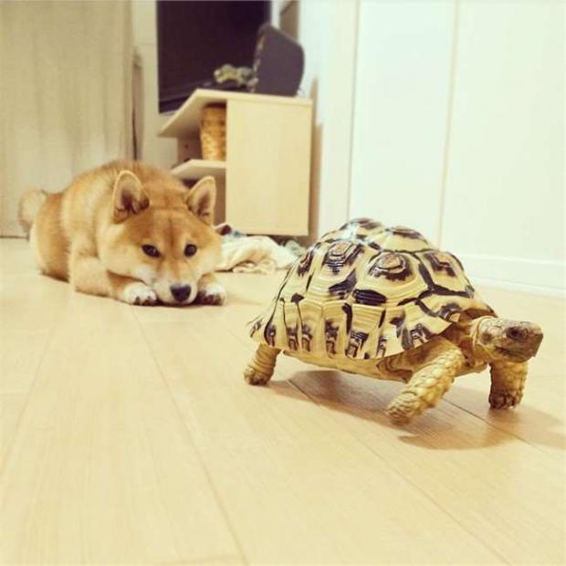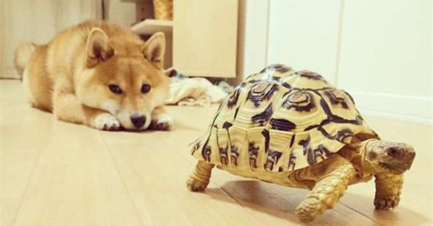 Trong thực tế, hai người sống cùng nhau trong một thời gian dài tự nhiên cũng sẽ có nét tương đồng. Điều này còn đúng với cả hai loài động vật sống cùng nhau. Chú chó Shiba Inu làm bạn với chú rùa, chúng lớn lên cùng nhau và có tình cảm thân thiết. Mặc dù khác loài nhưng sớm tối cùng nhau, hành vi của chúng càng ngày càng không khác biệt.