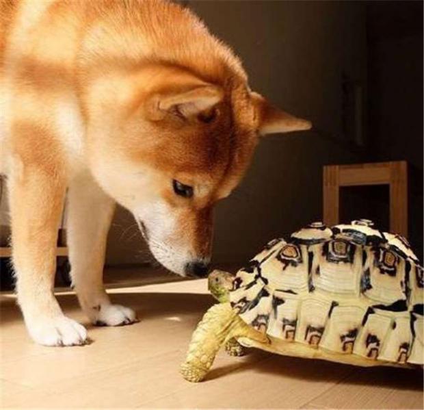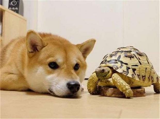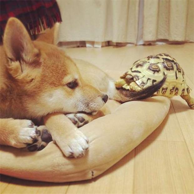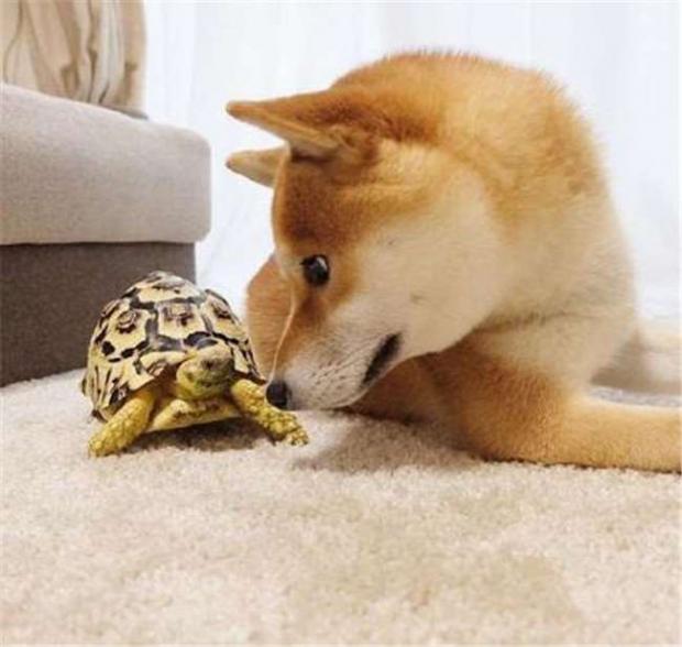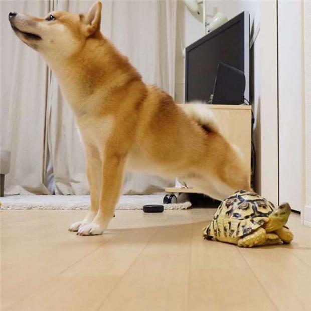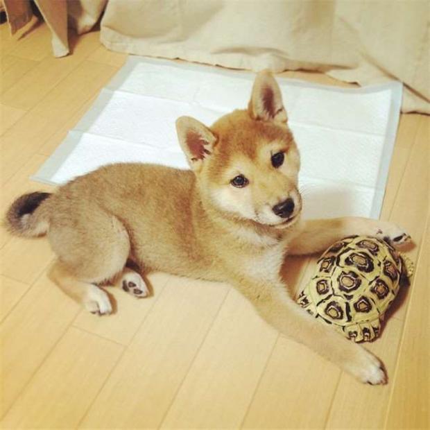 Bên phải là em rùa nhỏ, còn bên trái là chú chó Shiba Inu