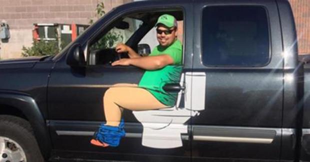 ▼Khi anh ngồi ở vị trí lái xe thì trùng khớp với tấm dán trên cửa xe, trông giống như người ngồi trên bồn cầu.