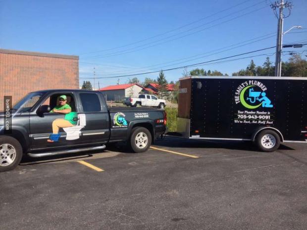 ▼Cách đây không lâu, Nick mở một công ty sửa chữa bảo hành đường ống có tên là “The Sault’s Plumber”. Anh hy vọng công ty của mình nhanh chóng được mọi người biết đến, cho nên đã xây dựng một tiêu chí kinh doanh thú vị và thiết kế banner sáng tạo dán trên xe tải.