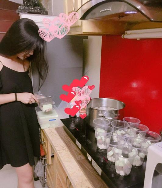 Bẵng đi một thời gian, Trà My lại khiến mạng xã hội bất ngờ khi những hình ảnh cô đứng bếp để chuẩn bị món chè khúc bạch được chia sẻ.