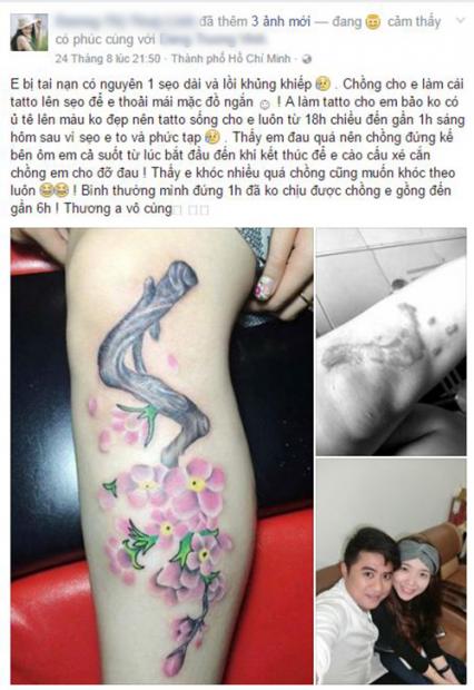 'Em bị tai nạn có nguyên một sẹo dài và lồi khủng khiếp. Chồng cho em làm cái tatto lên sẹo để em thoải mái mặc đồ ngắn. Anh làm tattoo cho em bảo không ủ tê lên màu không đẹp nên tattoo sống cho em luôn từ 18h chiều đến gần 1h sáng hôm sau, vì sẹo của em to và phức tạp. Thấy em đau quá nên chồng đứng kế bên ôm em suốt từ lúc bắt đầu đến khi kết thúc, để em cào cấu xé cắn chồng em cho đỡ đau! Thấy em khóc nhiều quá chồng cũng muốn khóc theo luôn. Bình thường mình đứng 1 tiếng đã không chịu