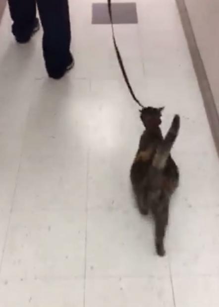 Con mèo xuất hiện với cái bụng rất to và nặng, có vẻ như nó có thể sinh bất cứ lúc nào. Sau đó 1 nhân viên đã đeo vòng cổ cho nó và dắt đi.
