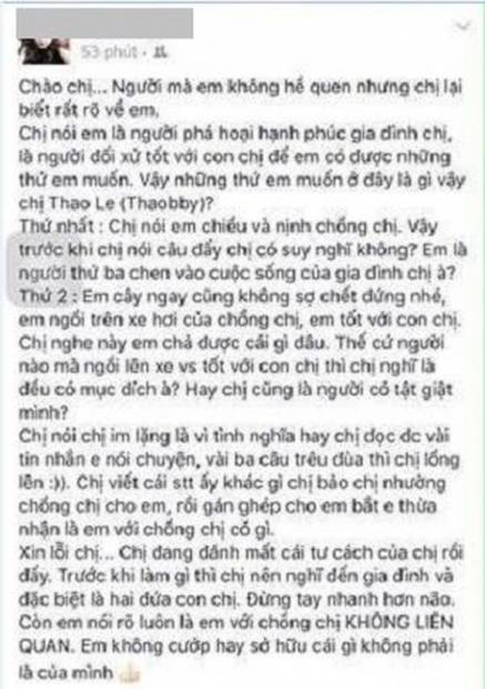 “Em không cần phải block facebook chị đâu N ạ. Sống thật với mình đi em. Cây ngay sao phải sợ chết đứng? Em xem em ngồi trên xe hơi chồng chị! Em tốt với con chị... Để e có được những gì em muốn rồi. Em đã vừa lòng chưa??? Chị biết hết tất cả, có điều chị im lặng vì tình nghĩa bấy lâu! Chồng chị, người tình trong mộng của em ấy, anh vẫn mong chị quay về hàng ngày đây. Nhưng chị biết vị trí của mình ở đâu. Chị biết cái gì thuộc về mình có duyên thì sở hữu còn đâu chẳng bận lòng tranh cướp