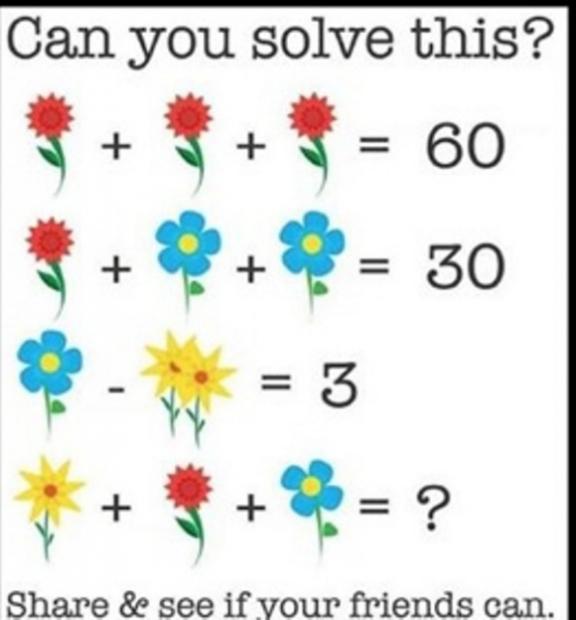Bài toán gồm 3 phương trình, là phép tổng khi cộng trừ những bông hoa. Phép tính thứ 4 chính là câu đố dành cho bạn.