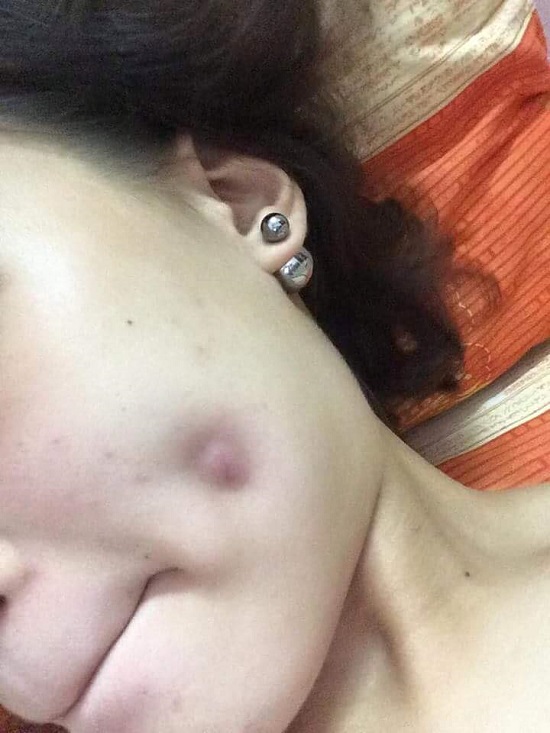 Hình ảnh cô gái trẻ bị nhiễm trùng khi đi hút mụn, phải can thiệp để mổ và hút mủ tránh cho mặt không bị hoại tử được chính cô gái này chia sẻ trên trang cá nhân. Sau khi tiến hành hút phần viêm nhiễm khuôn mặt cô gái đã không còn như trước mà có vết thủng trên mặt khiến cô còn không dám ra đường.
