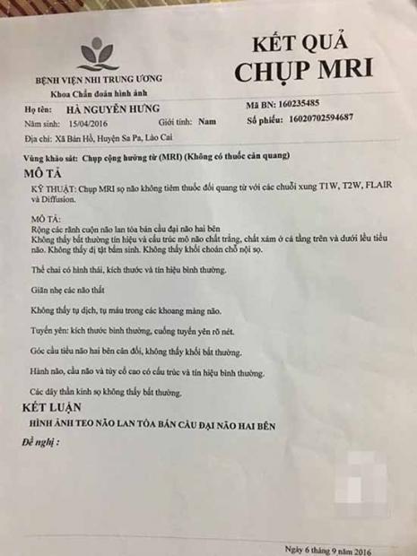 “Hơn 4 tháng lần lượt đi các bệnh viện, gần đây nhất là vào ngày 28/8, Bệnh viện Đa khoa huyện Sapa cử người đi theo mẹ con tôi xuống Bệnh viện Nhi Trung ương để kiểm tra. Con tôi hiện nay như đứa trẻ vô hồn, không có một phản xạ nào đáng kể.