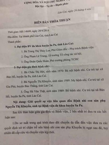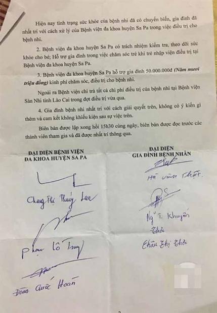 Theo biên bản thỏa thuận được lập ngày 28/4 giữa bệnh viện Sapa và gia đình sản phụ, phía bệnh viện cũng đã có nội dung giải quyết sự việc liên quan đến bệnh nhi con sản phụ Nguyễn Thị Khuyến, sinh tại Bệnh viện Đa khoa huyện Sapa.