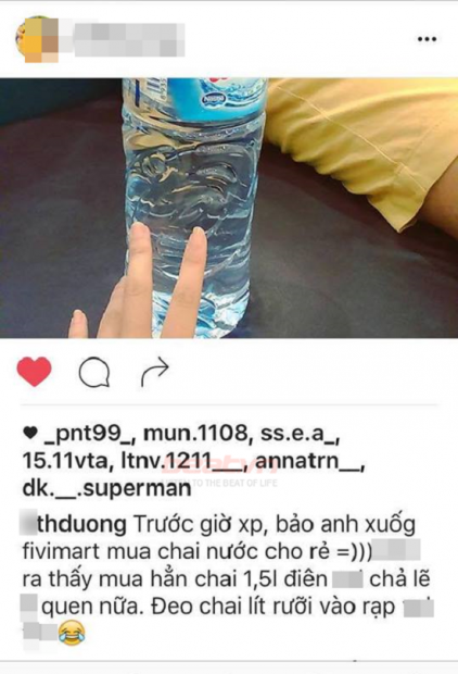 Thế nhưng khi anh quay trở lại, cô nàng tá hỏa vì anh người yêu 'hào phóng' đến độ mua hẳn chai nước khoáng với dung tích 1,5 lít. Cái cảm giác đeo chai lít rưỡi vào rạp khiến cô gái thốt không nên lời.