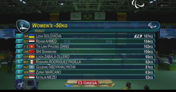 Đô cử Soloviova Lidiia của Ukraina giành Huy chương vàng với thành tích 107kg, lập kỷ lục Paralympic mới, còn đô cử Ahmed Rehab của Ai Cập giành Huy chương bạc với thành tích 104kg.