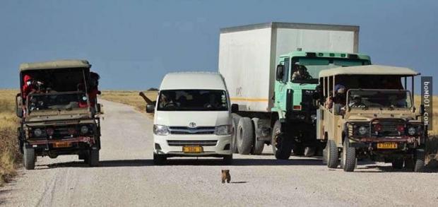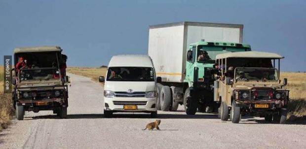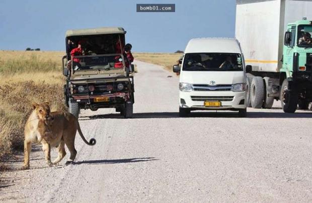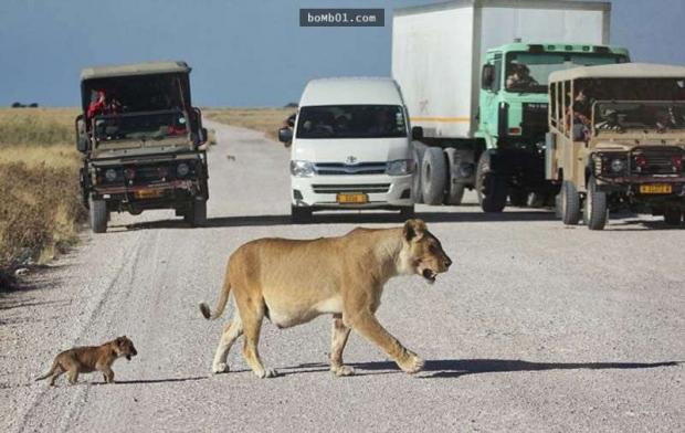Trên đường ô tô qua lại, một con sư tử mẹ dẫn theo sư tử con băng qua đường. Những chiếc xe tải lớn đang đi đã dừng lại nhường đường, dự tính đợi mẹ con sư tử đi qua mới tiếp tục chạy.
