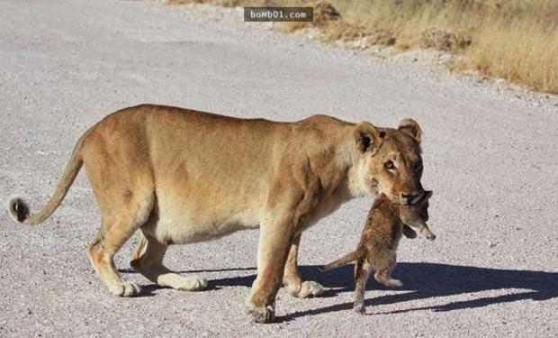 Cuối cùng, sư tử mẹ mất công không đưa con sang đường được, lại tha con quay về chỗ cũ.