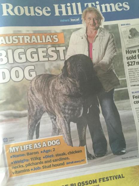 Với chiều cao 220 cm và trọng lượng 113 kg, chú chó Tây Tạng dòng Mastiff (giống chó tai cụp) tên là Baron này hiện đang là chú chó nặng nhất nước Úc. Hiện nay Baron mới chỉ 2 tuổi, và chú sẽ vẫn tiếp tục lớn hơn nữa trong vòng hơn 2 năm tiếp theo. Điều này cũng có nghĩa là, rất có thể Baron sẽ là chú chó lớn nhất thế giới sau vài năm nữa. Được biết kỉ lục này đang thuộc về một chú chó Mỹ, nặng 127.5kg