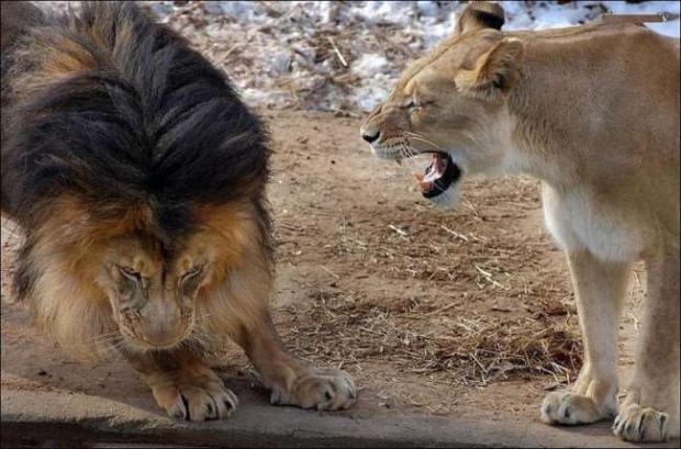 Thấy vậy, sư tử con vội vàng thoát khỏi nanh vuốt của ông bố nóng tính. Cậu bé đứng một bên xem cảnh bố bị mắng với vẻ mặt như muốn nói: “Có mẹ ở đây, con sẽ chẳng phải lo gì nữa.”