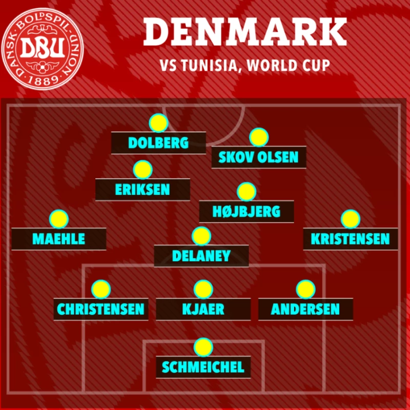 Đội hình ra sân của đội tuyển Đan Mạch trong trận đấu với Tunisia