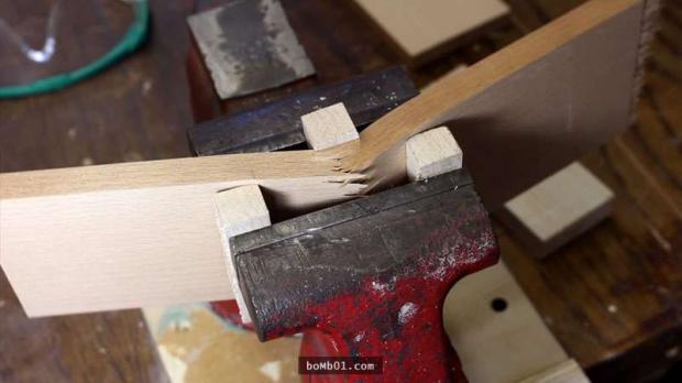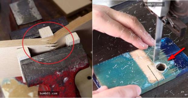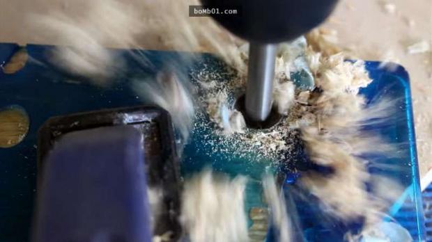 ▼Sau đó, anh dùng máy khoan để đục một lỗ rộng bằng ngón tay đeo nhẫn, rồi mới dùng cưa cắt lấy phần cần thiết.