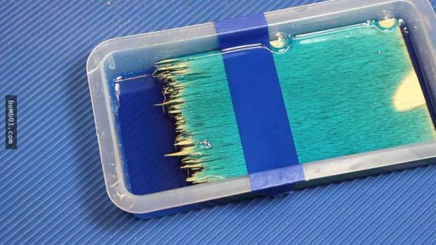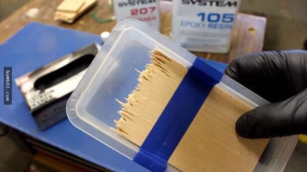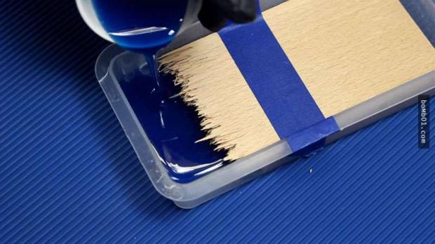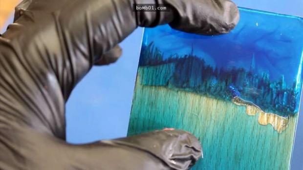 ▼Để tạo ra “bầu trời đêm” xinh đẹp, Peter dùng một loại nhựa epoxy, đổ một ít thuốc nhuộm màu xanh da trời vào rồi khuấy đều, sau đó đổ vào đầu gỗ bị gãy đựng trong hộp