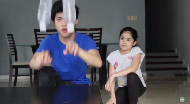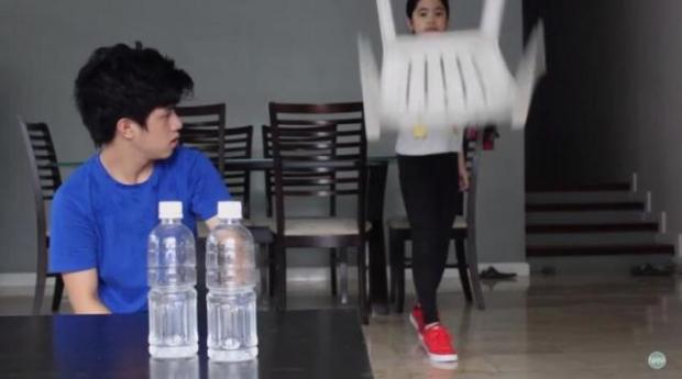 Anh chàng Ranz muốn thể hiện tài năng với cô em bé nhỏ bằng cách… quay ngược chai nước. Hai chai nước sẽ được ném lên quay một vòng, sau đó đứng yên trên mặt bàn.