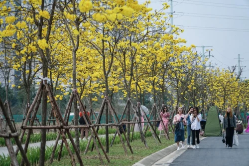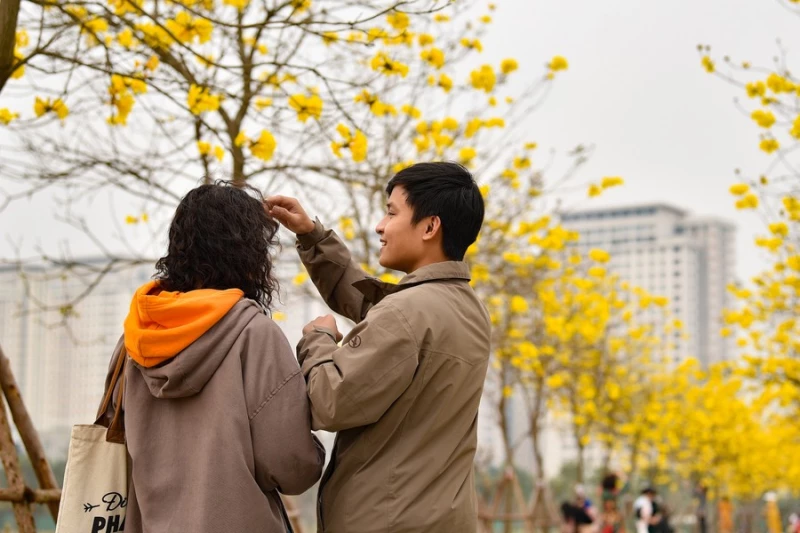 Những bạn trẻ cùng nhau tạo dáng bên loài cây đang nở rộ sắc vàng.