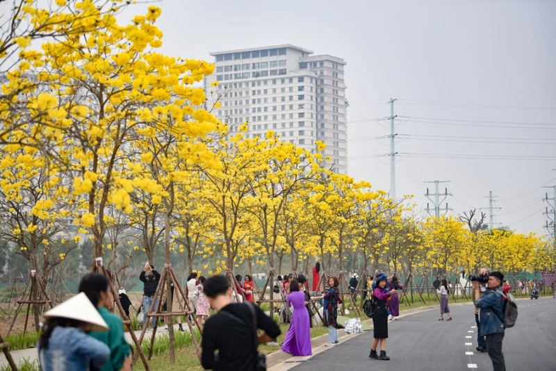 Theo ghi nhận, từ nhiều ngày nay rất nhiều người đổ về con đường hoa Phong Linh nằm trong khuôn viên khu đô thị ParkCity, phường La Khê, quận Hà Đông, TP Hà Nội để chụp ảnh.