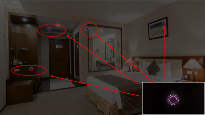 Các nơi phổ biến để kẻ gian dễ dàng nhét camera trong khách sạn, nhà nghỉ như là thiết bị điện tử, sau đó là thiết bị phát hiện khói, ổ cắm điện, TV kỹ thuật số, hộp Internet, ổ cắm trên tường, thiết bị lọc không khí, đồng hồ báo thức....