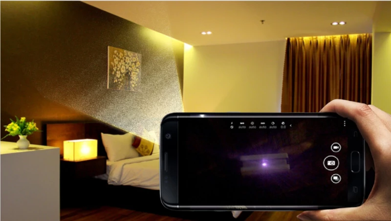 Việc đầu tiên bạn vào phòng không nên bật đèn ngay, hãy bật camera điện thoại và soi vào tất cả các nơi, ngóc ngách trong phòng để xem có phát hiện ra được ánh sáng bất thường nào không. Nếu có, đèn hồng ngoại trên camera sẽ được kích hoạt. Nếu trên khung ngắm xuất hiện các đốm sáng màu tím hoặc màu đỏ thì chắc chắn căn phòng này có gắn camera quay lén.