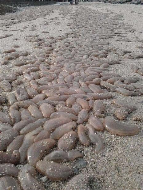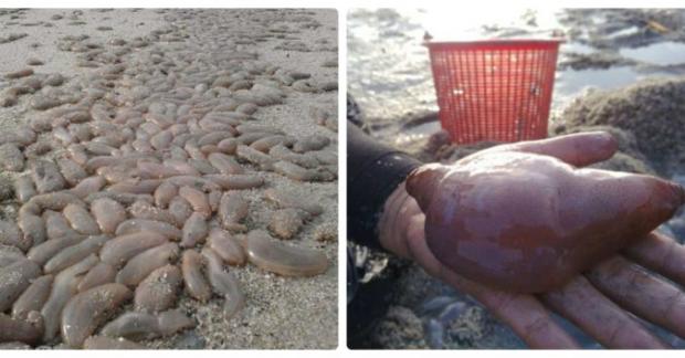 Một du khách trong một lần đến bãi biển Malaysia du lịch bắt gặp cảnh tượng những con động vật có hình hài kỳ lạ có chút đáng sợ này. Trông chúng giống như những con sên nhớp nháp bò xung quanh bãi cát.
